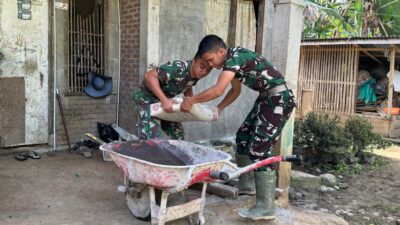 Pada tahap tersebut, personel Satuan Tugas (Satgas) TMMD bersama warga setempat bergotong royong mengaduk dan menuangkan campuran semen untuk memperkuat dinding bagian bawah rumah. Proses pengerasan dilakukan guna memastikan bangunan lebih kokoh, tahan lama, dan layak huni.
